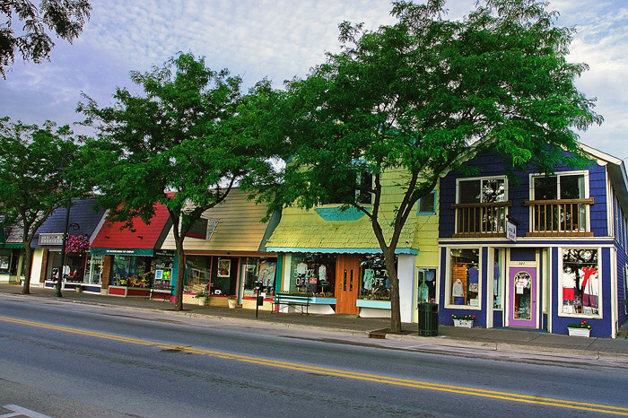 The tree-shaded sidewalks of Colorful Bridge Street overlooking picturesque Round Lake. Photo © copyright by Mike Barton.